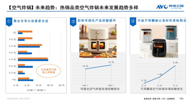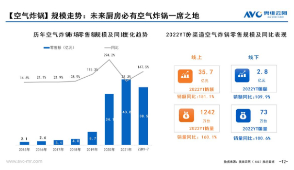 轻脂生活的用户热潮使空气炸锅深受消费者欢迎。《白皮书》显示,在当前增量市场背景下,在售品牌数量不断攀高,2022年空气炸锅全渠道销售同比均超100%,在2022年线上渠道的空气炸锅品牌达366个。同时,轻脂生活逐步进入人们的生活中,空气炸锅无油烹饪、加热速度快、腔体易清洁,更受当下运动人群的欢迎。相信在未来,厨房必有空气炸锅一席之地。