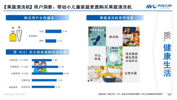近年受疫情影响,公众对于厨房小家电的健康属性已近乎“刚需”。病从口入,是家长对尚未养成良好卫生习惯的孩子的普遍担忧。它使果蔬清洗机在有孩家庭的渗透率是单身及无孩家庭之和的1.6倍。
