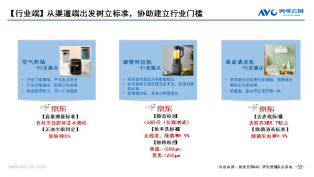 《白皮书》显示,当下阻碍趋势品类进一步发展的现存潜在阻碍主要分为行业与用户两大端口。针对行业端主要呈现的产品定义模糊、产品规格虚标、产品价格混乱问题,作为消费者信赖的家电选购渠道——京东家电积极推出一系列细分品类标准,如针对空气炸锅产品的“容量测量标准”“无油少脂判定”,破壁机的“免手洗标准”“静音标准”“粉碎粒径”与果蔬清洗机的“去农残标准”“除菌消杀标准”等协助建立行业门槛,助力优质优价的产品成为行业标杆。