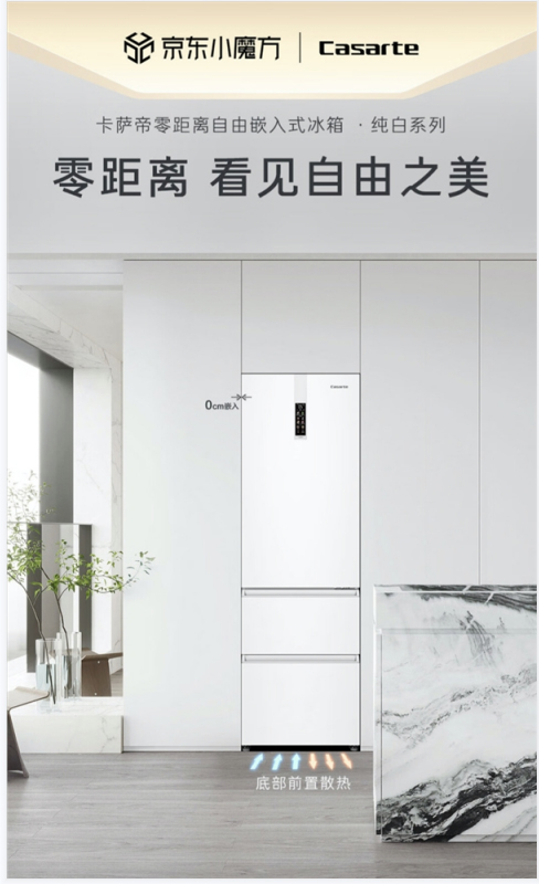 相比于普通冰箱,卡萨帝纯白零距离自由嵌入式380升冰箱,在视觉上能够与橱柜无缝融合,呈现厨房一体融合美学;空间上,由于改变了散热位置和门体结构,零嵌冰箱能紧贴橱柜放置,节省了厨房空间;使用上,因为去掉了冰箱两侧的散热缝,为用户减少了卫生死角。同时,保鲜层面,能够实现-30℃深冷智冻,以极地般低温保鲜出极为新鲜的食材。