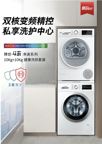 博世4系净速系列10Kg+10Kg健康洗烘套装解放阳台空间,让用户拥有更多私享空间。此外,除菌液洗+65℃除菌烘,除菌率高达99.9%;智能正反转系统全面抖散床单,热风均匀到达每个角落,实现100%除螨;强劲热风,深层穿透,带走异味分子,365天除潮祛味;三重护盾,守护全家人的健康。