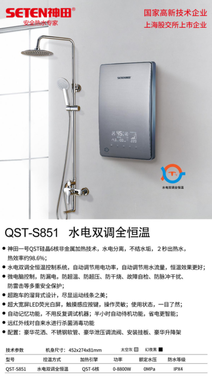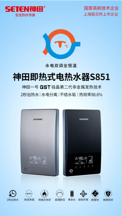 神田S851采用了“双芯双核硅晶加热+水电双调全恒温+溜背式亚克力面板+超大屏幕显示”的设计理念,产品竞争力远超目前行业内普通的即热产品。S851的诞生类似于苹果手机iPhone4进入中国市场,iPhone4让智能手机开始普及,S851将会引领行业普及水电双调全恒温技术。