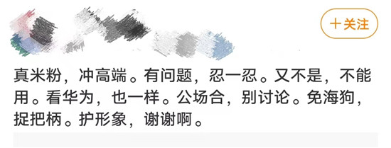 目前#小米11系列屡曝质量问题遭维权#话题中,很多博文内容基本是这套顺口溜中,不同因素排列组合式的抱怨。诸如,“三年冲高端,一起忍一忍”这种博文不胜枚举。但这次不得不说,华为是躺枪了。