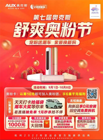 自1994年创立以来,奥克斯空调始终秉持“品质是基石创新是灵魂”的企业理念,专注于空调领域的技术创新和产品突破。2022年,奥克斯空调密集上市了5挂3柜共计8款新品,其中舒爽风套系、四季新风、奥知音套系组建起中高端产品矩阵,并于八月正式交付亚运场馆,进驻杭州奥体中心和桐庐马术中心,为举办精彩亚运贡献奥克斯力量。