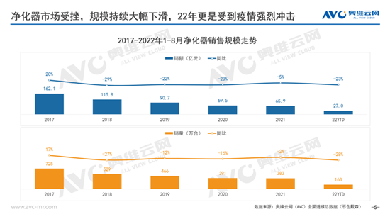 其实从空气净化器的发展历程上可以窥探一二。净化器行业近10年的发展分为4个阶段。第一阶段,13年借着雾霾经济的东风,净化器行业乘风而起,快速扩容的同时,也带来了一些乱象,各种品牌层出不穷,行业野蛮生长。第二阶段,2016年出台新标准,将不合格产品逐渐淘汰,大量品牌退出,行业被重新洗牌。第三阶段,2018年6月,国家发布打赢蓝天保卫战三年行动计划,雾霾经济迅速迎来终结,也促使净化器功能升级迭代,行业内部快速将目光转向当时还比较火热的房地产行业,净化器也和除甲醛深度绑定。第四阶段,21年至今,房地产行业开始下行,除醛和雾霾都无法拉动净化器的增长,净化器向改善生活品质呵护健康的方向渗透,但疫情对经济大环境产生了较为深远的影响,导致净化器至今仍难有起色。