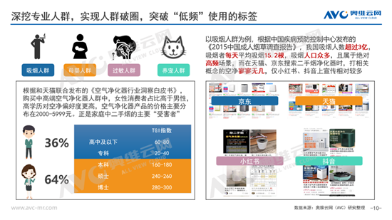 首先,二手烟影响深入人心,不需要重新进行产品教育,其次人口基数较大,2015年中国疾病预防控制中心发布的调查数据显示,中国成人有超3亿人吸烟,第三是这份调查数据同样显示,吸烟者人均吸烟15.2根,更是证明抽烟场景极其高频,最后是相关宣传较少,京东天猫几乎没有相关标签,抖音和小红书相对多些。而从需求角度看,根据奥维云网和天猫共同发布的《空气净化器行业洞察白皮书》显示购买中高端空气净化器的人群中,女性占比达64%,且学历越高对空气净化器的偏好度越高,而这类人群正是家庭中二手烟的主要“受害者”。