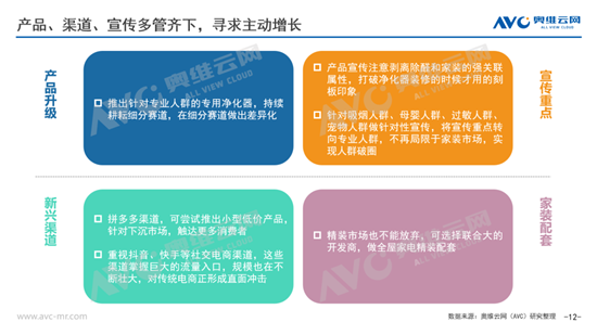 除了人群破圈,在现有市场下我们仍有很多可做之事,产品角度,需要推出针对专业人群的专用净化器,在细分赛道做出差异化;宣传角度,注意产品宣传注意剥离除醛和家装的强关联属性,打破净化器装修的时候才用的刻板印象,且针对吸烟人群、母婴人群、过敏人群、宠物人群做针对性宣传,将宣传重点转向专业人群,不再局限于家装市场,实现人群破圈;渠道角度,一是重视抖音、快手等社交电商渠道,目标人群减少的情况下,更需要多元的触及目标客户,二是针对拼多多等下沉,可尝试推出小型低价产品,提升产品渗透率,三是精装市场也不能放弃,可选择联合大的开发商,做全屋家电精装配套。