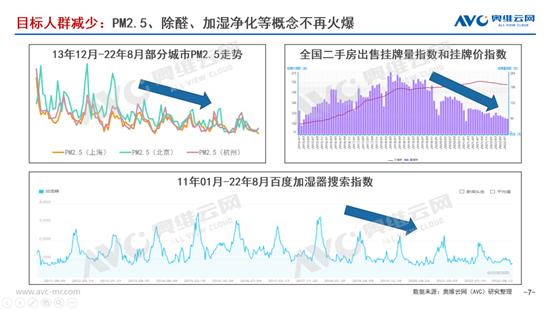 从数据方面也证明,曾经支撑净化器增长的3个概念PM2.5、除甲醛、加湿净化,受限于社会环境的变化,也无法支撑净化器持续上升,主要城市空气质量自18年起持续改善,二手房交易指数自19年开始也进入下行通道,加湿器搜索指数常年持平且近些年小幅下跌,都导致了净化器目标人群持续减少。