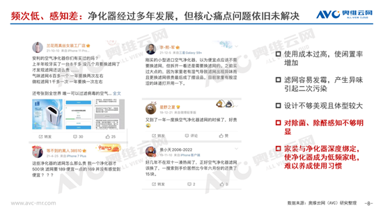 从评论来看,目前净化器仍有很多问题,如使用成本过高,导致废用率提升;滤网容易发霉,产生异味;设计不够美观,占地方等,都影响用户在复购时的决策,但最关键的两个要素,一是消费者感知不够明显,购买因素相对隐性,相对于雾霾导致漫天白雾,影响视野,提醒消费者正在吸入雾霾,甲醛、细菌的存在更不容易被人感知,更难激起消费者对净化器的购买欲望。二是与家装的深度绑定,则导致使用频次过低,在家装过使用一段时间后,就会遭到弃用,难以养成长期的使用习惯。