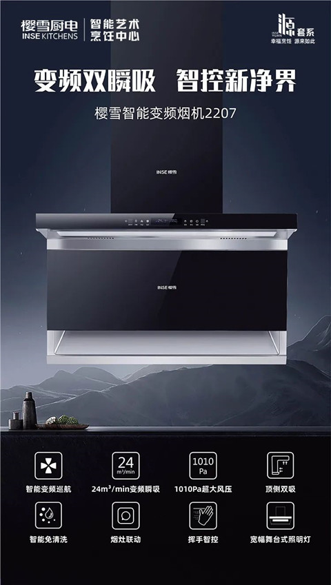 樱雪智能变频烟机2207是烟机焕新的不二之选,让用户重拾烹饪创造的乐趣。其搭载直流变频动力系统,可实时根据风阻情况来调速,保持持久大吸力,并智能调压。烹饪高峰期瞬时开启1010Pa大风压、24m3/min大吸力,让烹饪时光,也能随心所欲。