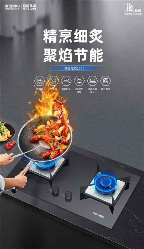 樱雪魔焰2201,其拥有可适调底盘设计,适用于中式厨房常见的(630~700)x(330~390)mm的开孔尺寸,基本满足市场上所有品牌灶具的开孔,无需再次动工改造台面,自由烹饪又进一步!