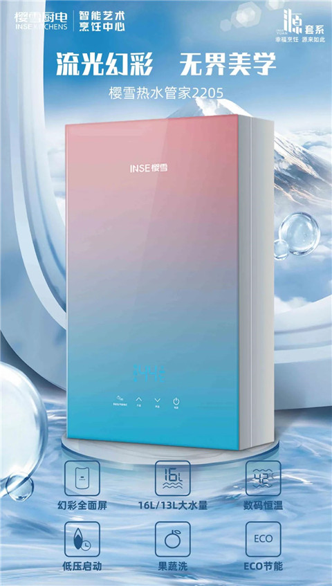 樱雪热水管家2205打破沉闷外观,以夏日海边落日余晖为灵感搭配黄金海岸全面屏设计,油污一擦即净,时刻保持高颜值,给家里添多一件靓丽的装饰品!