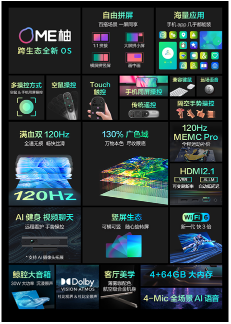 康佳智慧场景屏R6全系搭载全新ME柚旗舰OS系统,既能实现百万APP无限安装,多任务系统随时切换海量应用,又拥有四种拼屏显示模式,可打造百种生活应用场景,实现同屏多窗多人共享互不干扰的自由拼屏;支持Miracast/Airplay/DLNA/Huawei Cast+等丰富的投屏协议,支持多路投屏、无网投屏,实现毫秒级传输速度,再多投屏内容也可轻松实现无延迟、无拖尾。此外,ME柚OS内置双向驱动模式,结合重力感应屏科技,65吋R6搭配康佳自有专利技术90°旋转挂架,可实现横竖屏旋转,拥有竖屏定制首页,可以刷短视频、健身、游戏等,竖屏下也完美支持移动生态应用,电视横竖都精彩!