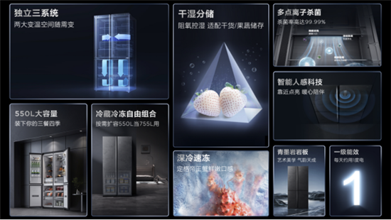 这款冰箱拥有555L超大容量,其中固定冷冻室160L,固定冷藏室185L,自由变温室210L。此外,变温区温度可实现-18℃~5℃区间内自由变换,冷藏冷冻自由变,满足美妆、药品、母婴以及蔬果等多种物品的存放需求。