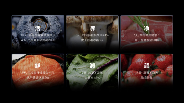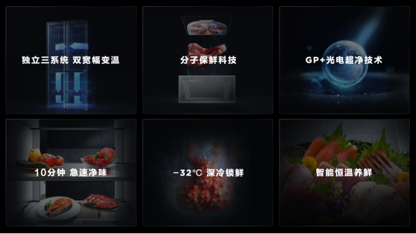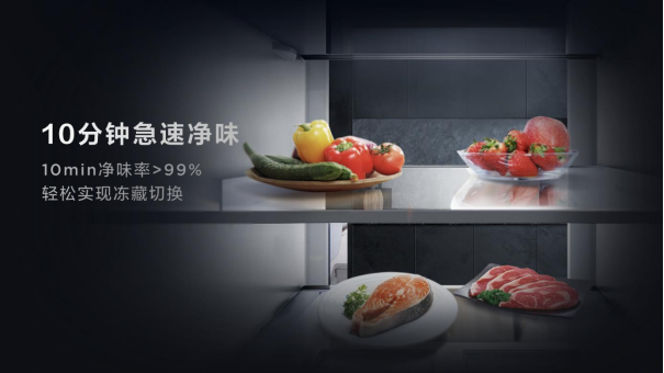TCL在格物冰箱Q10上搭载了与中国食品科学与技术领域第一的江南大学食品学院联合研发的分子保鲜科技。其实,这一技术源自于原本应用在大型生鲜冷库的磁场保鲜技术,通过磁场延缓微生物、细胞分子的新陈代谢,并以此提升海鲜、肉类等食材的新鲜度。虽然磁场保鲜技术具备良好的保鲜效果,但由于结构复杂、空间内温度及磁场精准控制调整困难、能耗与成本较高等因素,要应用于消费级市场较为困难。