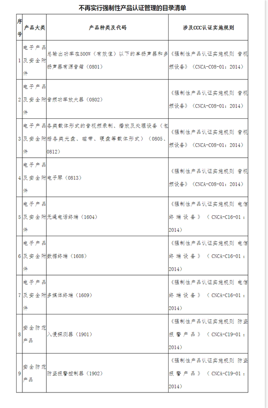 一、对安全风险较低、技术较为成熟的9种电子电器产品不再实行CCC认证管理(见附件)。