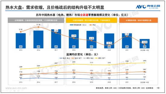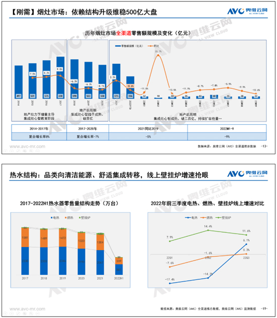 体验升级。疫情使消费者重新审视之前的生活方式,体验型消费成为首选,与健康有关的话题度也在不断升级。例如智能、低噪的油烟机,增压零冷水燃气热水器更受消费者的青睐。例如,2022年1-9月,燃热线上增压零冷水零售额同比增长28.5%,对非增压和非零冷水的产品市场形成明显的迭代趋势。