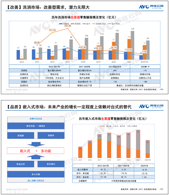 微纳集成。集成厨电让有限的空间承载更多可能,极大程度上提升了中式厨房的使用体验。这也是集成灶、嵌入式复合机近年来获得增长的重要原因。集成洗碗机更是成为了今年的大热门,2022年1-9月零售额同比增长了68%。
