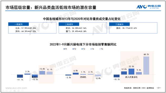 重点区域市场容量,将主要着眼于T2-T5低线市场的新兴品类。二三线存量房优势、小镇人群的消费能力优势,使得集成灶、洗碗机、嵌入式等新兴品类在T2-T5级市场获得更明显的增长。体验更好的新兴厨电,将会持续在低线市场盘活消费者的品质需求。