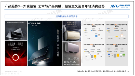 外观颜值。当前,厨电产品早已从单纯地满足使用功能发展成为一种美学的展现,最明显的趋势之一是极致的超薄机身。例如,油烟机的超薄低吸、热水器的扁桶外观的零售额增速在今年均有不错的表现。
