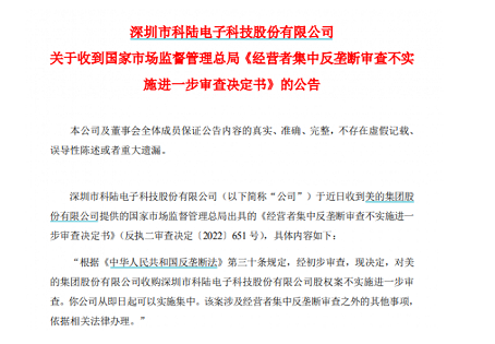 根据公告,公司于近日收到美的集团股份有限公司提供的国家市场监督管理总局出具的《经营者集中反垄断审查不实施进一步审查决定书》,具体内容如下: