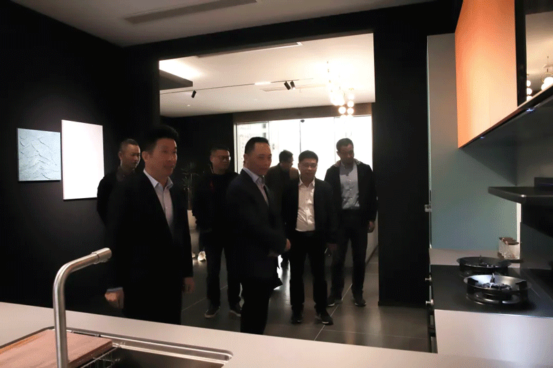 嵊州市人大常委副主任潘启富一行首先参观了美多新营销大楼高端不锈钢全屋定制展厅。在参观中,钱文忠董事长亲自介绍了美多集成灶+橱柜+衣柜一成套系统性高端不锈钢全屋定制的优势。钱董表示不锈钢橱全屋定制不仅无甲醛危害,还可有效防潮、防霉、防火、抗腐蚀,大大提高了实用性与耐用性,不锈钢定制外观设计也可以让全屋更显时尚、轻奢与科技感。