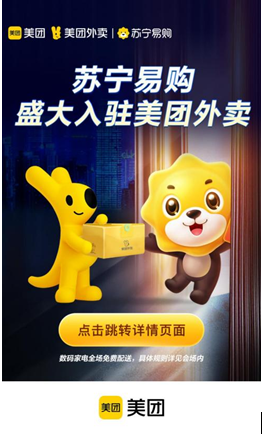 10月21日,苏宁易购宣布与美团达成战略合作,成为正式入驻美团平台的首家家电3C品类大型连锁品牌。