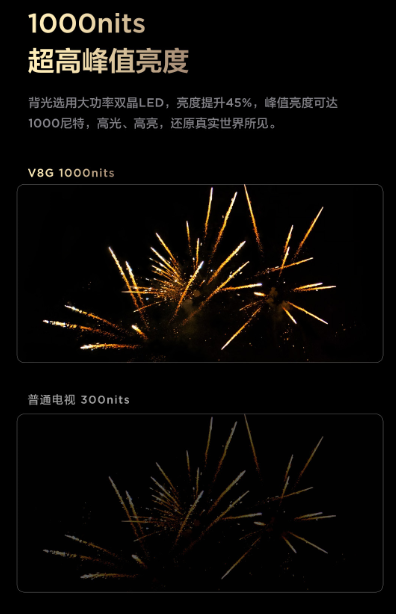 TCL V8G最高的峰值亮度达到1000nits,50吋也有800nits,可以让画面中该亮的地方更亮,接近自然界的环境光,同时也可以保留更多的暗场细节,达到更高的对比度,为用户还原更真实的场景,与某米和某信仅有的几百峰值亮度相比,简直是天壤之别。