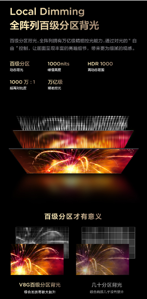 现在拥有好画质的智能电视,都具有背光分区技术。但是,背光分区技术里的水也很深,因为不同的背光分区数也会影响画质的好坏。因为每个背光分区的光都可以单独控制亮暗,所以当电视的分区数越多,单点控制区域就越多,控光就会更精准,画面细节就会更清晰。行业新发布的《电视画质分区标准》表明,背光分区数只有几十级的,画质的提升都是微乎其微的,到了百级分区,电视画质会有明显提升。TCL V8G全系列都有百级背光分区,在同级别产品中的画质表现,几乎无人能敌。