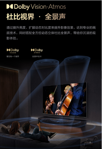 TCL V8G除了出色的硬件性能,还搭配了Dolby Vision&Atmos技术。Dolby Vision(杜比视界)是美国杜比实验室推出的影像画质技术,通过提升亮度、扩展动态范围来提升影像效果。Dolby Atmos(杜比全景声)支持杜比全景声技术的产品,能从低音、高音、人声、环绕和全景声多个维度营造空间感和包围感,令声音在四面八方流动,让您在家中拥有杜比影院的观影享受。