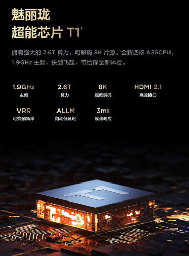 TCL V8G搭载魅丽珑超能芯片T1(T982机芯),使用的是12nm的制作工艺,支持8K片源解码,让4K电视也可以高质量播放8K影视,同时T1的主频达到1.9GHz,是目前整个电视行业主频最高的芯片。