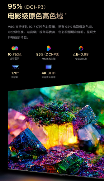 TCL V8G支持10.7亿种色彩显示,拥有95%电影级原色高色域,色准达到△E<0.99。DCI-P3色域是美国电影行业推出的一种衡量影片画质的一项标准,数值越高,越接近影院真实放映水平。所以TCL V8G的95%(DCI-P3)色域值相对于某信BT.709的色彩表现层次更鲜明,更丰富真实。