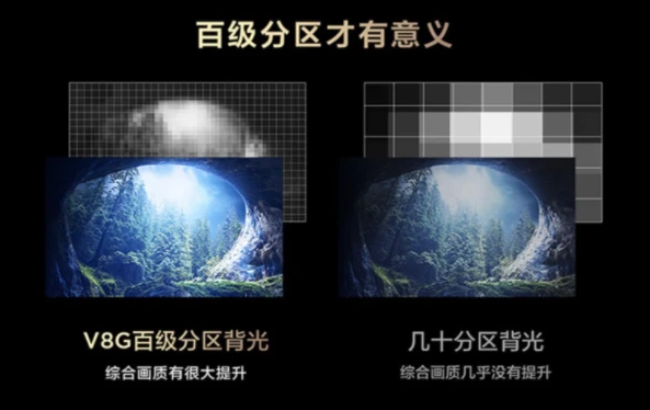 TCL V8G采用了当下火热的“背光分区技术”。根据此前发布的《电视分区背光标准》来看,当液晶电视只有几十级背光分区时,对于电视的对比度提升是很有限的,而当电视的分区数量来到百级的时候,就开始有明显的提升。而V8G所拥有的百级背光分区,相比传统液晶电视的几十级背光分区,对于综合画质就有着相当明显的提升。