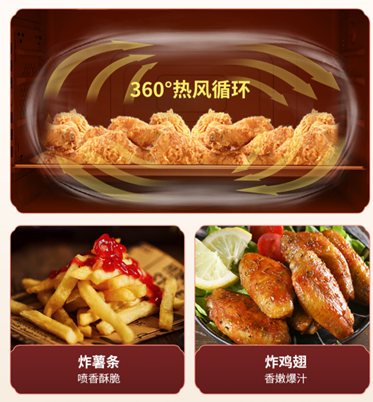 采用热风循环技术,大直径热风风扇360°高速循环,热风气流又快又均匀,迅速穿透食材,带走多余油脂,保持香脆口感。