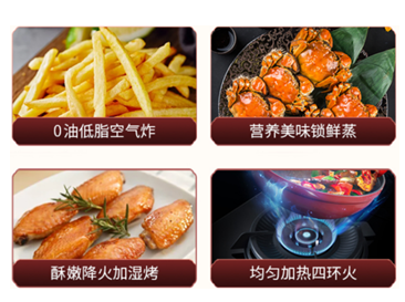 煎烤炖煮蒸烤炸,各种烹饪方法,有它就能轻松GET!燃脂空气炸,美食健康更低脂。5.2kW爆炒火,炒菜更香,250W煲汤火,煲汤更稳,宽域火力自由调节。更能自如切换多种蒸烤模式,轻松烹制豪华盛宴。