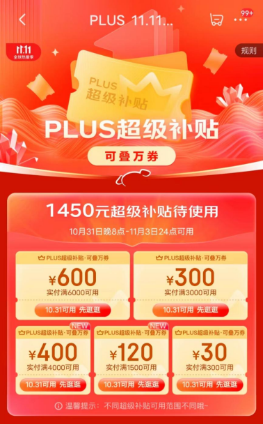 但是有两点值得注意:一方面,这些大额券不可以购买苹果手机等部分手机类目和空调等家电类目,具体需要看购物车商品提示;另一方面,这些券使用有效期截至11月3日晚12点,这距离11月11日还有8天!不参加双11当天活动的双11券,也是令人很费解。