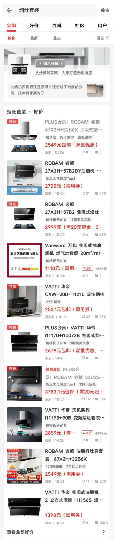 举个例子,我们在什么值得买进行“油烟机套装”搜索,有6篇标注有“价格低于618”或是“128/128天新低”,128天前就是618活动,另外4款商品具体页面无法显示过往价格,大概率是没有被收录。