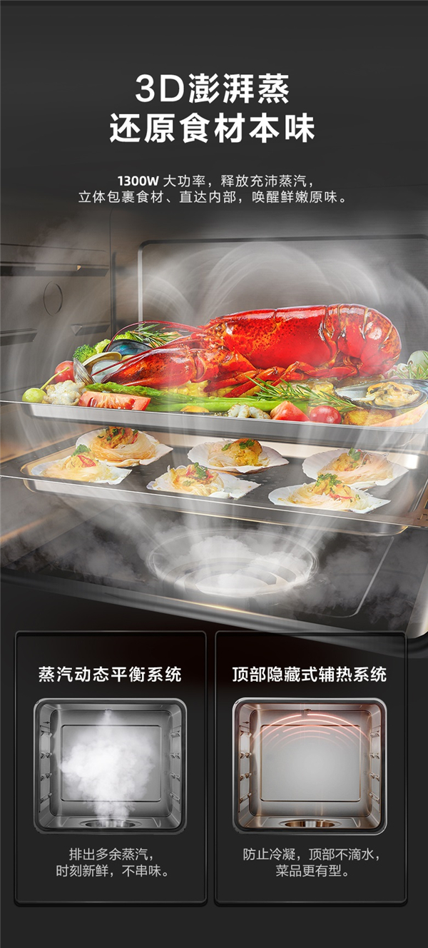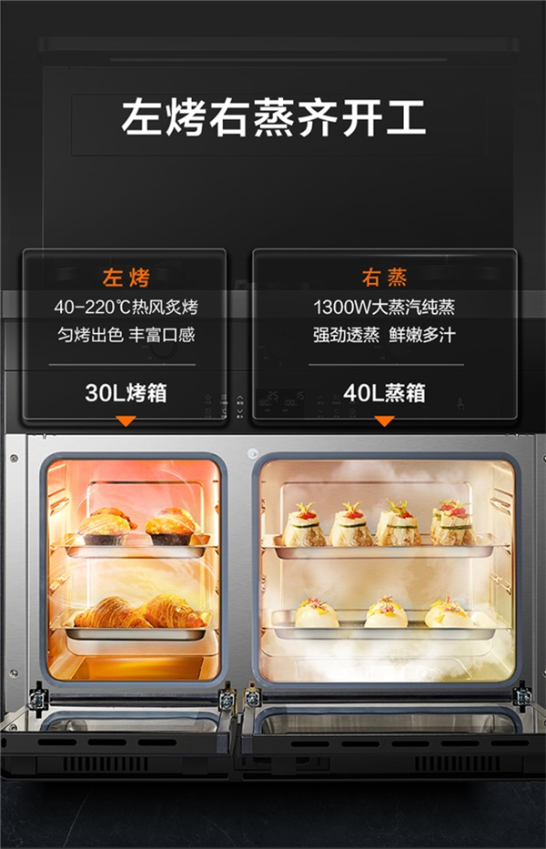 相比于传统的蒸烤一体集成灶蒸、烤功能只能二选一,苏泊尔UQ77集成灶拥有独立的蒸箱、烤箱,清蒸与焙烤完全可以同步进行,搭配燃气灶,可以一次性完成三种不同烹饪方式的菜肴,将烹饪变得更高效、节能、甚至是多样化!