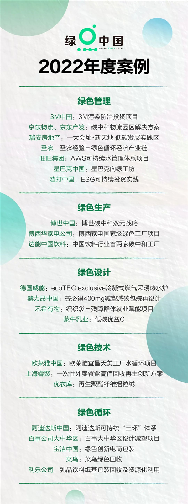 今年站在“双碳”战略目标的绿色起点,第一财经发起了中国绿点计划(China Green Point,CGP),致力于记录中国净零排放的开端,并于6月启动了“绿点计划·首届可持续实践案例评选”项目。首届评选吸引了200多个来自于各行各业头部企业的案例竞相参选,评选结果于近日揭晓,博西家电旗下子公司——博西华家用电器有限公司“博西家电国家级绿色工厂项目”以优异的表现在最终评审中脱颖而出,荣获“绿色生产·绿点中国2022年度案例”。这一奖项的获得,不仅彰显了博西家电植根中国市场近三十年来对可持续发展理念的积极践行,更充分肯定了博西家电在绿色制造领域的亮眼成就。