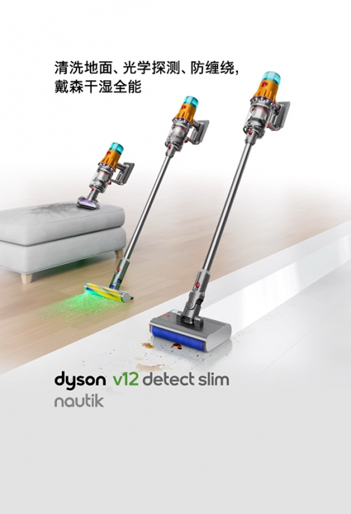 作为戴森推出的首款洗地吸尘器,戴森V12 Detect Slim Nautik在保留原先V12的可视化清洁、防缠绕技术等核心技术的前提下,加入了戴森Nautik洗地滚筒配件,集灰尘探测、防缠绕、清洗地面等功能于一体。根据官方推荐使用流程,是先用纤巧软绒滚筒吸头去进行地板吸尘,通过吸头上碳纤维材质的静电反应,能从地面吸除最细小的微尘,防止拖地时把地上的碎屑、过敏原等灰尘污染物推到其他地方,吸尘结束之后再加上Nautik洗地滚筒配件再进行拖地清洁,确保地板能够得到真正的清洁。