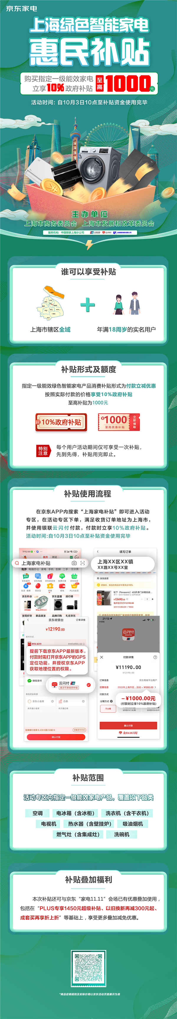 即日起,定位在上海、年满18周岁的消费者,在京东App搜索“上海家电补贴”、“上海消费补贴”、“上海家电补贴9折”等关键词即可进入活动页面。活动专区内下单补贴商品,满足收货订单地址为上海市,并使用银联云闪付付款,即可享受补贴优惠。注意!每个用户活动期间仅可享受一次补贴,先到先得,不容错过!(领取指南详见下方长图)