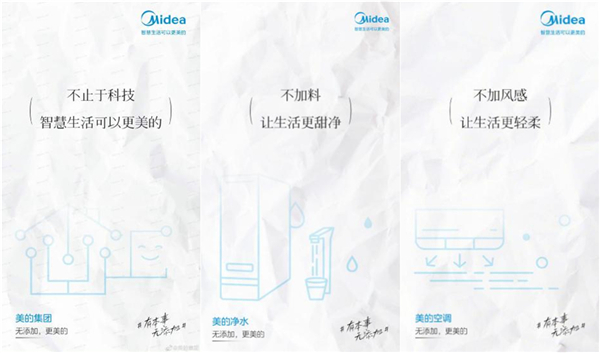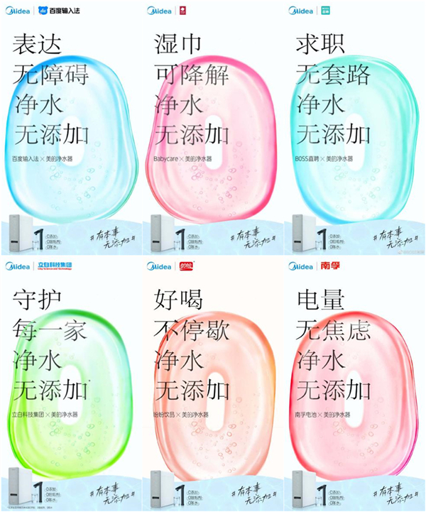 除短片引发的话题互动之外,美的净水还联合了Boss直聘、南孚集团、⽴⽩集团、百度输⼊法、Babycare、盼盼饮料等30个品牌发布「无添加」系列海报,一同贯彻无添加生活主义。