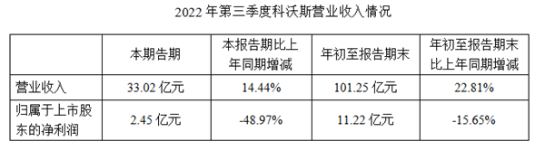 其中,2022年第三季度实现营业收入33.02亿元,同比增加14.44%,实现归母净利润2.45亿元,同比下滑48.94%,实现扣非归母净利润2.65亿元,同比下滑33.71%。