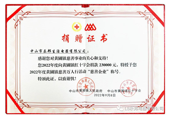 慈善企业”,这既肯定了乐邦对黄圃镇慈善事业的大力支持,也彰显了乐邦电器的社会责任与担当。