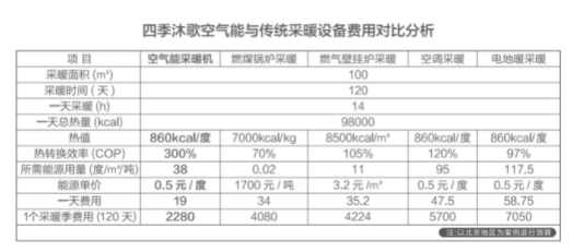 那么,四季沐歌空气能具体耗电量如何?以100㎡三居户型采暖为例,采暖4个月,每天运行14小时,在每天消耗热量98000kcal的标准下,通过四季沐歌空气能采暖每天只需消耗19元,为期4个月的采暖季共花费2280元,对比电采暖节省4770元,同时相比于燃煤锅炉采暖、燃气锅炉采暖和空调采暖各节省约1800元、1944元、3420元。然而,其采暖效果却远远优于燃煤采暖、电暖气以及空调采暖,这正是许多消费者选择四季沐歌空气能冷暖机的最重要原因之一。