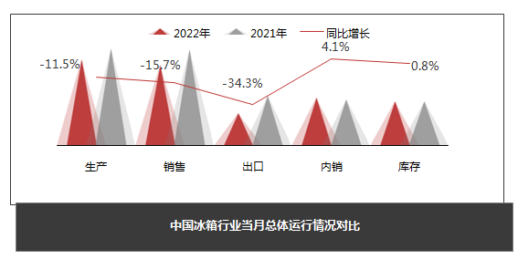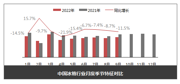 1-9月冰箱总产量为5699.2万台,同比下降10%;总销量为5764.9万台,同比下降10.4%;总出口量为2754.3万台,同比下降16.6%;总内销量为3010.6万条,同比下降3.9%。