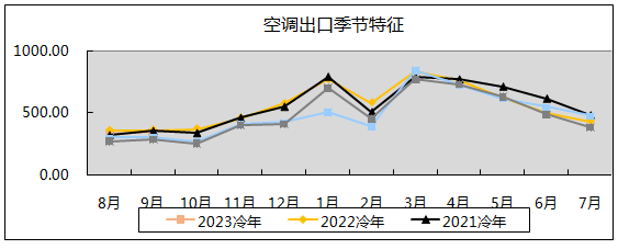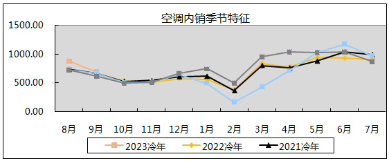 2023冷年累计家用空调生产2140.15万台,同比增长5.18%,销售2243.29万台,同比增长6.00%,其中内销出货1570.29万台,同比增长12.64%,出口673.00万台,同比下降6.82%。