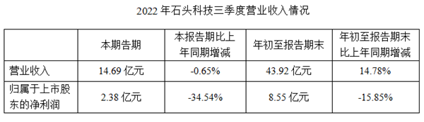石头科技发布2022年三季报,发布2022年三季报,前三季度实现营业收入43.92亿元,同比增加14.78%,实现归母净利润8.55亿元,同比下滑15.85%,其中,2022年第三季度实现营业收入14.69亿元,同比下滑0.65%,实现归母净利润2.38亿元,同比下滑34.54%。