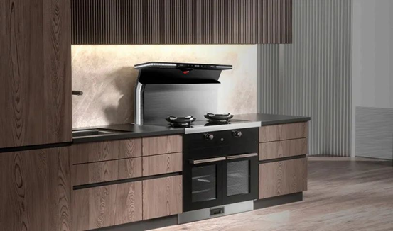 除了配件高端定制化,在集成系统方面,金帝也带来了更高级的表现。阵列星芒灯带系统,以高指数显色,带来点亮生活的厨房场景氛围。星舰流体力学动力设计系统,汲取德系豪车为灵感,机头采用星舰外观设计,呼应品牌的“航天”品质;大角度折弯叠加弧形包裹,配合流体钢塑导流系统,让油烟顺滑导流进烟道,在扩散之前被彻底吸净。中西厨蒸烤集成系统,以等容双腔带来“一烤双蒸”的多功能、复合式搭配,适合不同厨房场景下的烹饪需求。