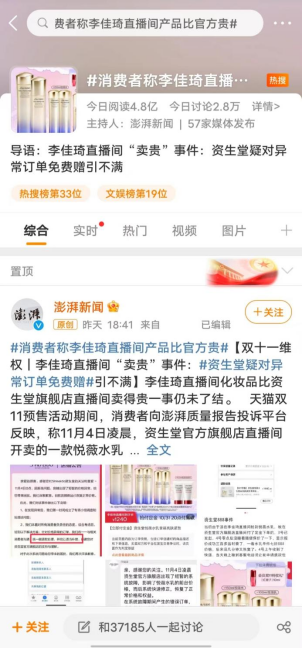 根据李佳琦的粉丝称,李佳琦直播间资生堂的一款约为水乳套装价格为1188元,但是在11月4日凌晨,资生堂直播间同款产品仅需888元,比李佳琦直播间便宜了300元。这一事件也在11月8日冲上热搜#消费者称李佳琦直播间产品比官方贵#。